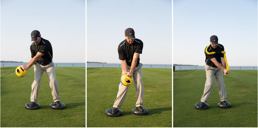 Leverage Discs are patented, air-filled discs with a hole in the middle specially designed for golfers to develop explosive rotational movements. Leverage Discs are completely different from generic balance discs with a bulge in the middle which are most commonly used for static balance exercises.